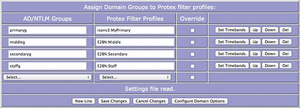 Assuming that the NTLM server details have been set and that the Protex server has been successfully joined to the AD Domain the next step is to assign Protex filter profiles to the relevant AD groups. At least one group/filter pair must exist before NTLM authentication will work correctly.